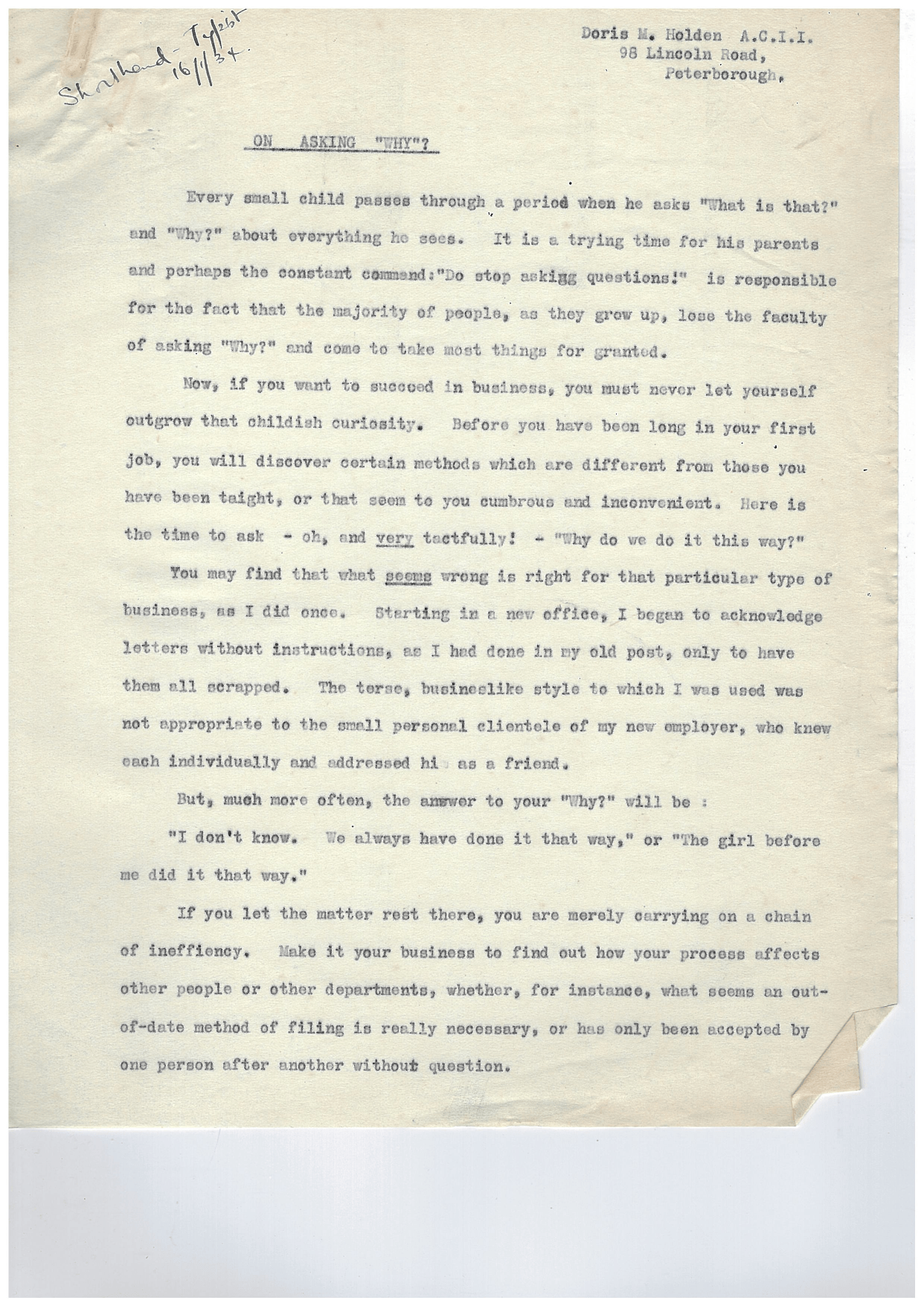 Now, if you want to succeed in business, you must never let yourself outgrow that childish curiosity. Before you have been long in your first Job, you will discover certain methods which are different from those you have been taught or that seem to be cumbrous and inconvenient. Here is the time to ask - oh, and very tactfully! “Why do we do it this way?"