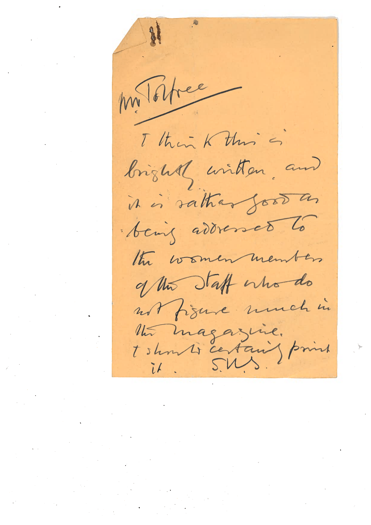 So I look back over my "twelve years hard", laughing a little that I should have called hard a job with fixed hours and no night duty, thankful for what I gained, and not least for the facility with the pen gained in duels with worthy antagonists in branch offices, which is proving such a pleasant hobby for my house-tied evenings. A voice breaks into my thoughts