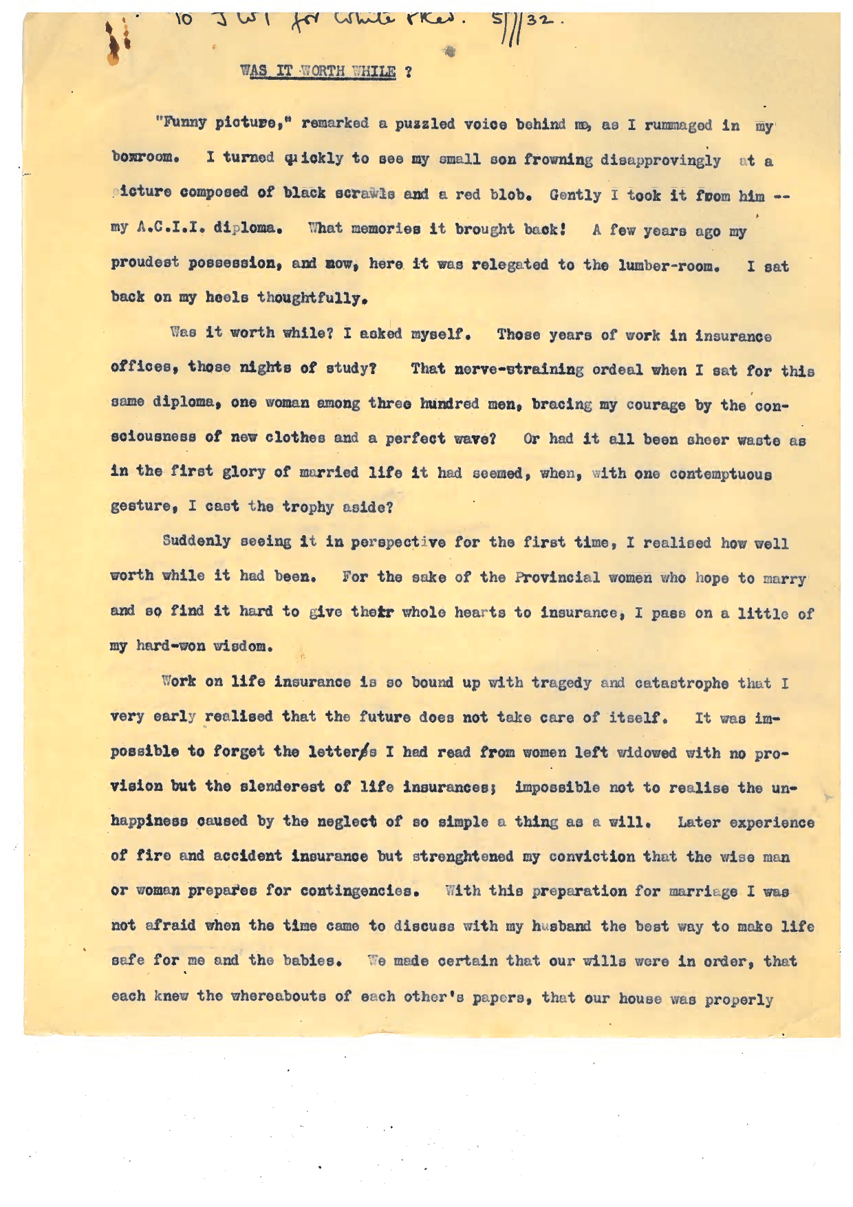 Suddenly seeing it in perspective for the first time, I realised how worthwhile it had been. For the sake of the Provincial women who hope to marry and so find it hard to give their whole hearts to insurance, I pass on a little of my hard-won wisdom.
