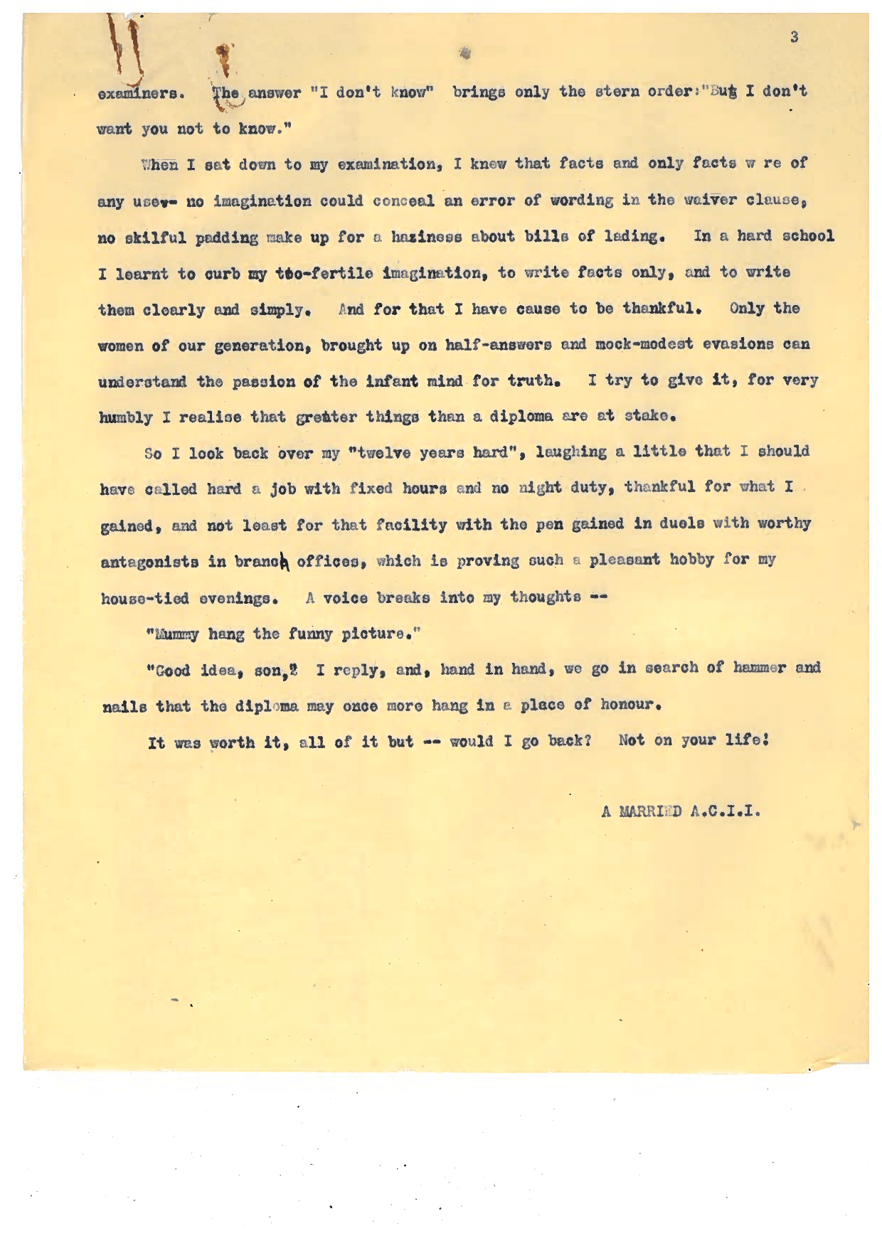 When I sat down to my examination, I know that facts and only facts were of any use~ no imagination could conceal ‘an error of wording in the waiver clause, no skilful padding make up for vagueness about bills of lading. In a hard school I learnt to curb my too-fertile imagination, to write facts only, and to write them clearly and simply. And for that I have cause to be thankful, Only the women of our generation, brought up on half-answers and mock-modest evasions can understand the passion of the infant mind for truth. I try to give it, for very humbly I realise that greater things than a diploma are at stake.