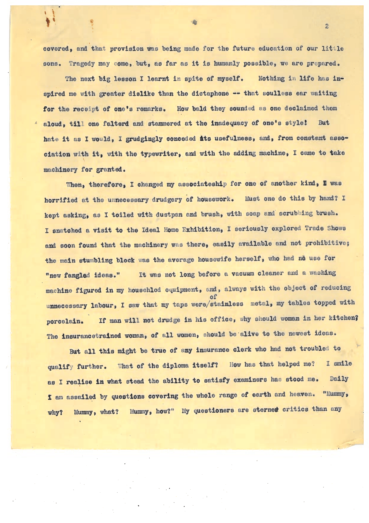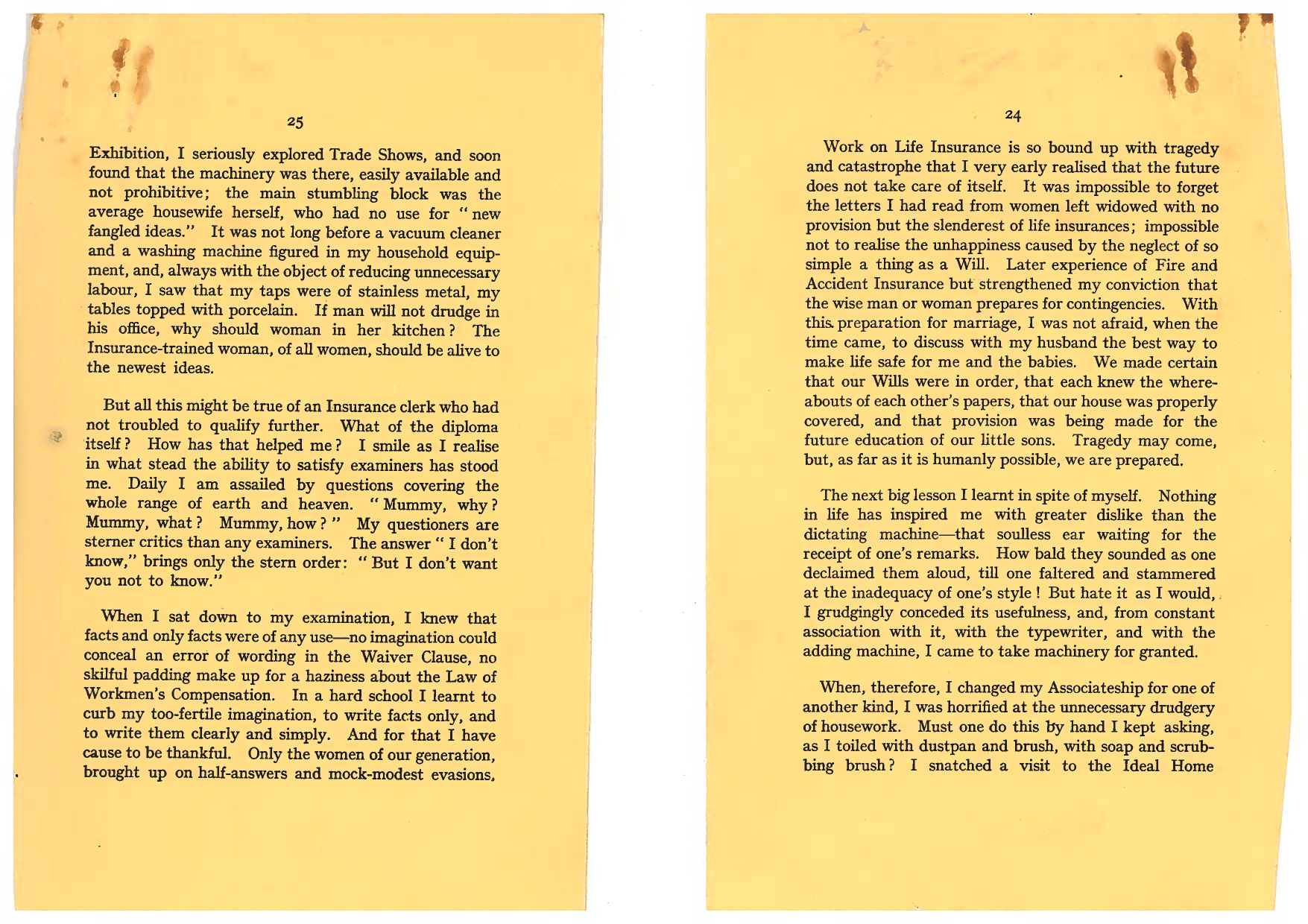 When, therefore, I changed my associateship for one of another kind, I was horrified at the unnecessary drudgery of housework. Must one do this by hand? I kept asking, as I toiled with dustpan and brush, with soap and scrubbing brush. I snatched a visit to the Ideal Home Exhibition, I seriously explored Trade Shows and soon found that the machinery was there, easily available and not prohibitive; the main stumbling block was the average housewife herself, who had no use for "new Fangled ideas." It was not long before a vacuum cleaner and a washing machine figured in my household equipment, and, always with the object of reducing unnecessary labour, I saw that my taps were of stainless metal, my tables topped with porcelain, If man will not drudge in his office, why should woman in her kitchen? The insurance trained woman, of all women, should be alive to the newest ideas.