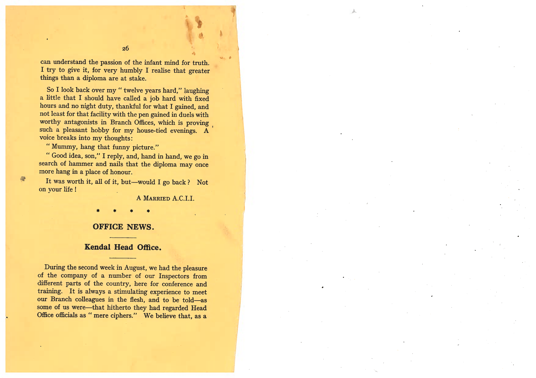 “Funny picture," remarked a puzzled voice behind me, as I rummaged in my box room. I turned quickly to see my small son frowning disapprovingly at a picture composed of black scrawls and a red blob. Gently I took it from him -- my A.C.I.I. diploma. What memories it brought back! A few years ago my proudest possession, and now, here it was relegated to the lumber-room. I sat back on my heels thoughtfully.