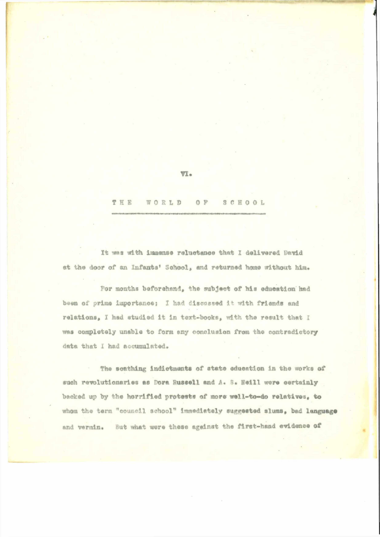 The seething indictments of state education in the works of such revolutionaries as Dora Russell and A. S. Neill were certainly — backed up by the horrified protests of more well-to-do relatives, to i whom the term “council school” immediately suggested slums, bad language and vermin. But what were these against the first-hand evidence of neighbouring mothers who, one by one, had sent their sons to the nearest Infants' School, with no apparent contamination of mind, language or body, and a noticeable improvement in happiness?