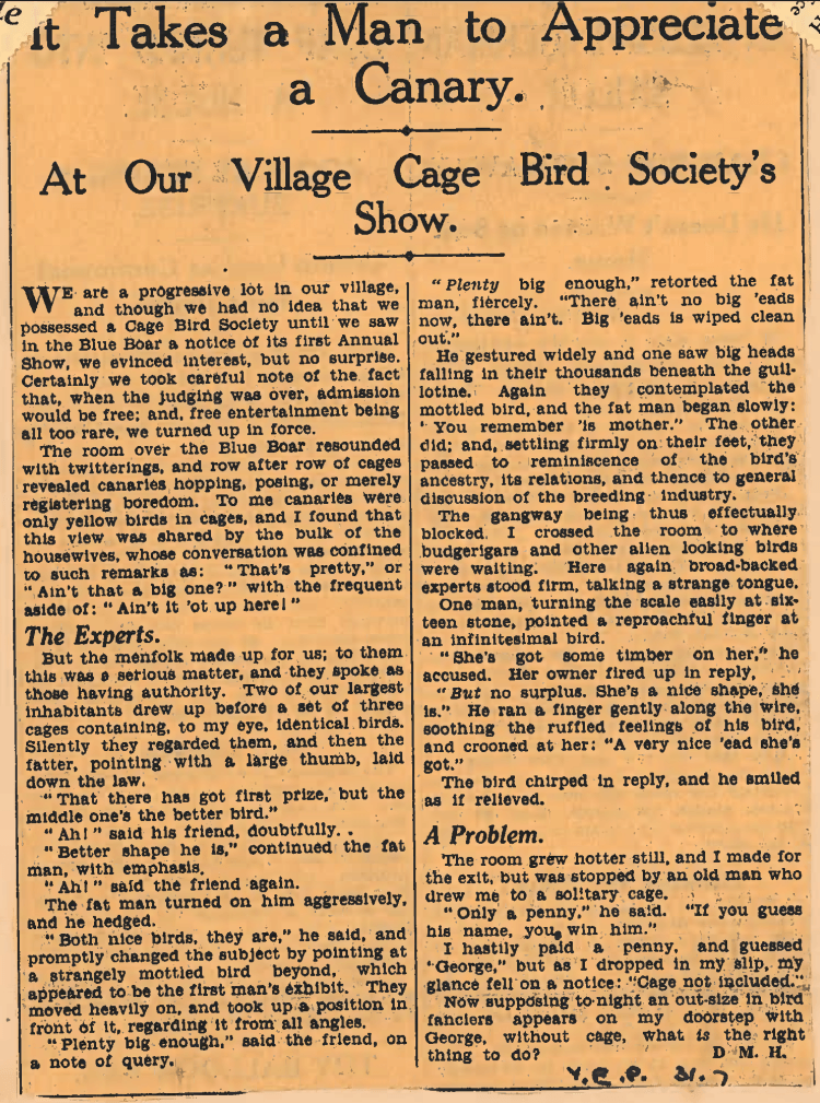 We are a progressive lot in our village and though we had no idea that we possessed a Caged Bird Society until we saw in the Blue Boar a notice of its first Annual Show, we evinced interest, but no surprise. Certainly we took careful note of the fact that, when the judging was over, admission would be free, and free entertainment being all too rare we turned up in force.