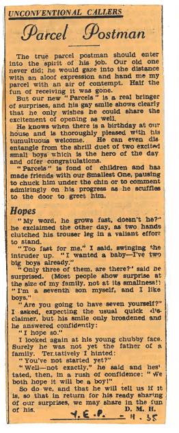 The true parcel postman should enter into the spirit of his Job. Our old one never did; he would stand on the doorstep gazing far away into the distance with an aloof expression and hand me my parcel with casual contempt, I was always seized with a sensation of guilt. Was the parent insufficiently stamped or wrongly addressed? Did it betray too obviously its unfashionable origin? I had to look hastily to reassure myself and part of the pleasure of receiving it was lost.