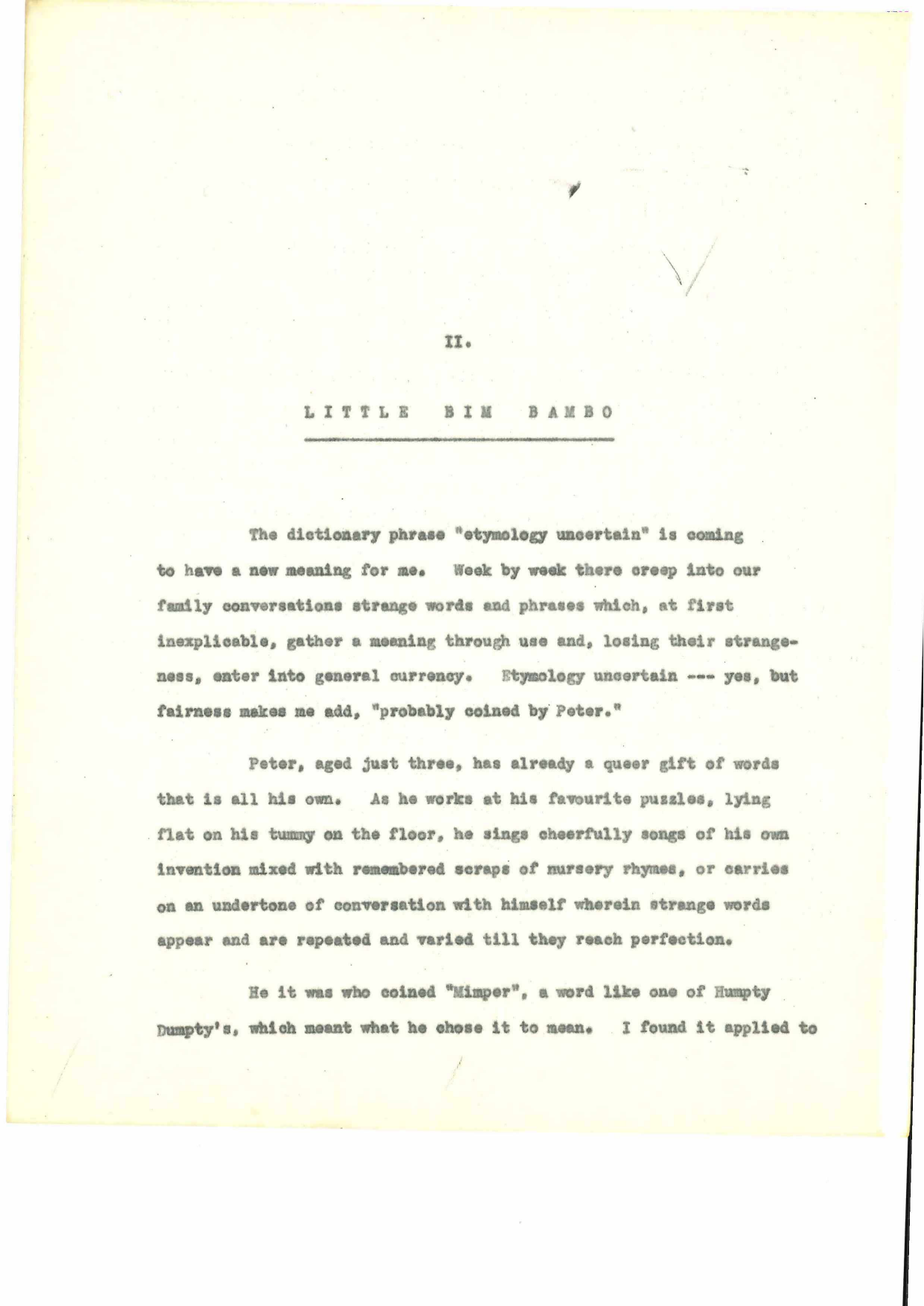 The dictionary phrase “etymology uncertain” is coming to have a new meaning for me. Week by week there creep into our family conversations strange words and phrases which, at first inexplicable, gather a meaning through use and, losing their strangeness, enter into general currency. etymology uncertain - yes - but fairness makes me add, “probably coined by Peter."